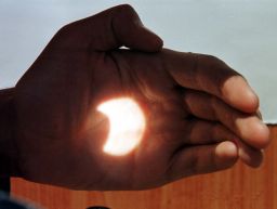 Jordanian reflects the beginning of an eclipse of the sun August 11. In Jordan, air raid sirens wailed Across the Kingdom 12:15 p.m. to announce One-hour countdown to the start of a partial Solar eclipse. aj/Photo by Ali Jarekji REUTERS Received at Wednesday, August 11, 1999 - 8:25 AM |