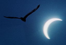 A seagull flies next to the partial eclipse of the sun seen over the sea in the Ukrainian Black Sea resort of Yalta, August 11. The moon covered about 90 percent of the sun in Yalta during the eclipse. yk/Photo by Gleb Garanich REUTERS Received at Wednesday, August 11, 1999 - 9:31 AM |