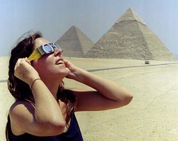 Georgina Rojas, a Mexican tourist, stands in Front of the 4,500-year-old great pyramids of Giza as she looks at the sun with special glasses Before the August 11 partial eclipsed of the sun. The last solar eclipse of the 20th century swung Across Europe and the Middle East on Wednesday, giving millions of people their last Chance to witness one of nature's great Spectaculars. The eclipse began when the Shadow of the moon completely covered the sun At 09:31 GMT off Canada's east coast near Nova Scotia and started its 1,500 miles per hour (2,400 kph) race across the Atlantic Ocean. An/Photo by Aladin Abdel Naby REUTERS Received at Wednesday, August 11, 1999 - 9:42 AM |