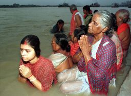 A group of women pray while taking a dip in the Ganga river during the solar eclipse in the eastern Indian city of Calcutta August 11. A solar eclipse is considered inauspicious in Hindu mythology and devotees pray and bathe in rivers to clean themselves. An overcast sky prevented people from viewing the eclipse in West Bengal province. js/Photo by Jayanta Shaw REUTERS Received at Wednesday, August 11, 1999 - 9:44 AM |