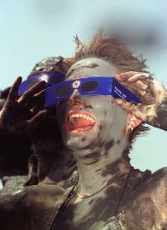 A Bulgarian tourist plastered with therapeutic Mud watches the solar eclipse as it passes over The Black Sea city of Balchik, August 11. The Moon covered total the sun in northeast Bulgaria For 146 seconds during the last solar eclipse of The millenium. dd/Photo by Petar Petrov REUTERS Received at Wednesday, August 11, 1999 - 9:50 AM |