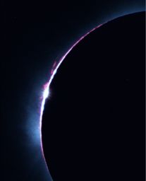 A photograph just a second before the moon completely covers the sun with the last sunbeams visible on the left side, also known as Baily's Beads, taken near Neunkirchen some 50 km south of Vienna August 11. The last total solar eclipse of this millennium attracted thousands of spectators, causing traffic jam on the streets in the zones of totality. hp/Photo by Heinz-Peter Bader REUTERS Received at Wednesday, August 11, 1999 - 8:45 AM |