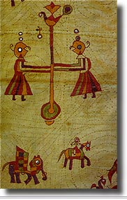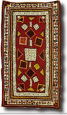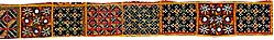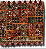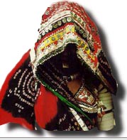 Here is a 'banjara' (gypsy woman) from the Rajasthan desert of North western India. The endless stretches of sands make the enormity of the desert starkness. What we can have here is the veil known as the 'Odhni' which almost bears itself down under the combined weight of the embroidered bead, glass and thread work. Even the weight of the veil seems rich with purpose in a land that shields its women behind 'Purdah'(which literally means a curtain but which figuratively represents a world from the outside with in which women must reside) However the Banjaras are relatively free of such norms and live a life dotted with the wildest of reds, yellows, greens, blues and blacks. While on men these colours appear on their turbans, on women these find place on their 'Ghagraas &Cholis' (long skirt and blouse respectively) The red and black material in white spots draped around her has come out of a printing technique known as 'Bandhani' typical o Rajasthan and uses vegetable dyes in the brightest of hues. | |