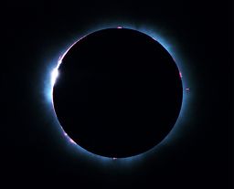A photograph just a second before the moon completely covers the sun with the last sunbeams visible on the left side, also known as Baily's Beads, taken near Neunkirchen some 50 km south of Vienna August 11. The last total solar eclipse of this millennium attracted thousands of spectators, causing traffic jam on the streets in the zones of totality. hp/Photo by Heinz-Peter Bader REUTERS Received at Wednesday, August 11, 1999 - 8:45 AM |