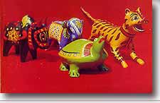 Clay toys form a veritable part of the crafts of India These are almost always found to feature the brightest of colours with the patterns on their bodies in contrasting colours, perhaps in an effort to match childrens' imagination.