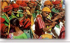 Celebration of colours on the day of the Festival of Colours(Holi).This is Gujrat(weastern India) where women dance while men play the flute.
