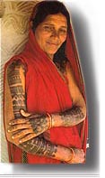 Resplendent in red, this woman from densely forested tribal Bastarlocated in Madhya Pradesh(central India), reveals her elaborately tattooed arms. She is proud to have them on her as her smile would suggest, because these motifs convey the identity of her tribe. |